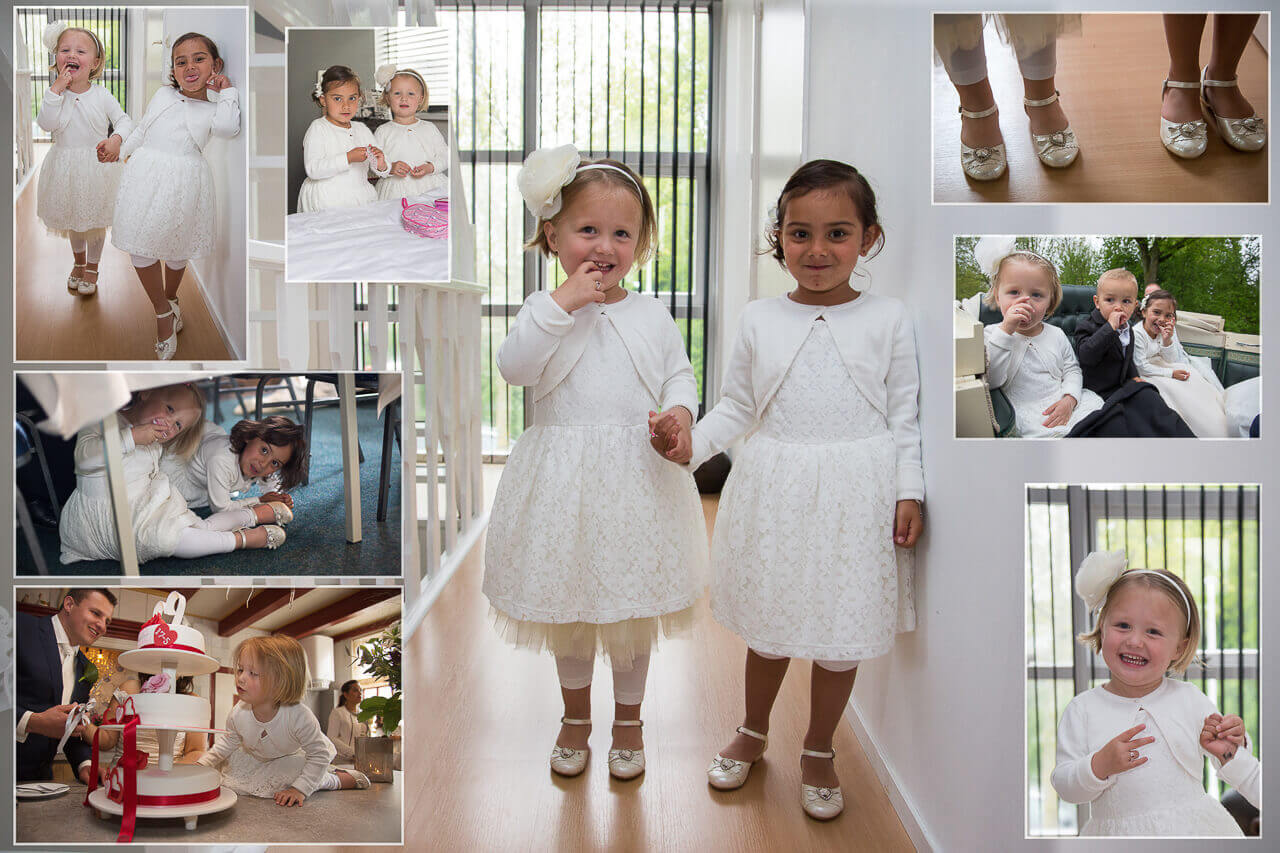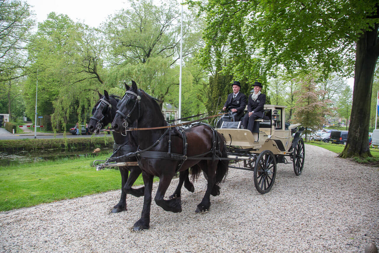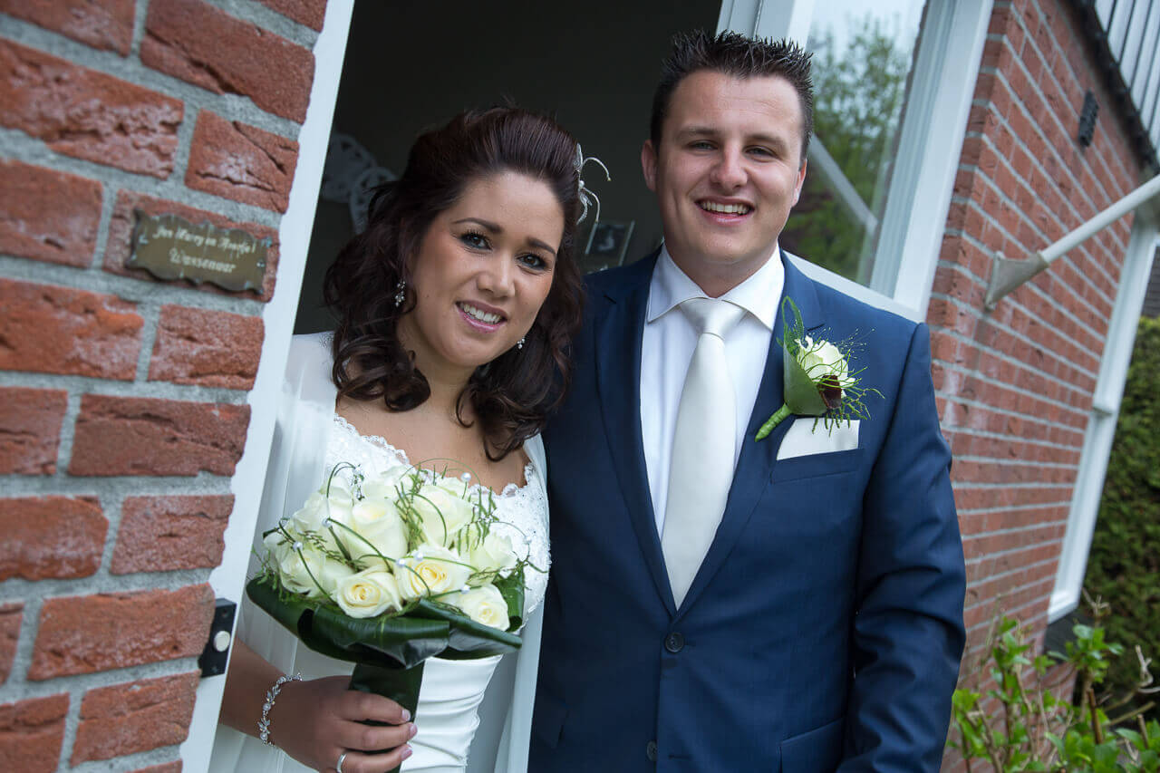 Vrijdag 17 mei zijn Gerard en Daphne getrouwd. Na een zeer prettig kennismakingsgesprek eerder in het jaar, was al snel duidelijk dat ik hun trouwdag mocht ik fotograferen. Een erg leuk stel! De dag begon voor mij in Buitenpost bij het aankleden van de bruiden de bruidsmeisjes. De bruidegom was elders in Buitenpost om later met paarden en een mooie koets zijn toekomstige vrouw op te halen. Het ophalen van de bruid leverde leuke foto’s op, gevolgd door een kleine fotoreportage bij de paarden met koets. Hierna met de open koets richting het gemeentehuis in Buitenpost gereden voor de ceremonie. Na de gebruikelijke bordesfoto vertrok de trouwstoet naar De Plaets in Burgum. Voor de lunch kwamen alle daggasten bijeen voor een aantal groepsfoto’s. Daarna ging het trouwpaar met mij richting het bos van Ypey, waar we de trouwreportage hebben gefotografeerd. Een mooie lokatie met verschillende settings om foto’s te maken. Voor de reportage hadden we ruim een uur gepland. Na het aansnijden van de taart op de Pleats in Burgum en een rust momentje was het tijd voor het avonddiner. Een leuk moment om in alle rust de gasten te fotografen en ook de kinderen terwijl ze aan het spelen zijn. Hierop volgde een rit naar de kerk voor de huwelijksinzegening. Ook zijn er nog twee witte duiven losgelaten uit een prachtig rood hart. Toen het feest begon, zat voor mij de trouwreportage erop. De complete reportage is na enkele weken aangeboden op dvd’s inclusief enkele fotocollages.